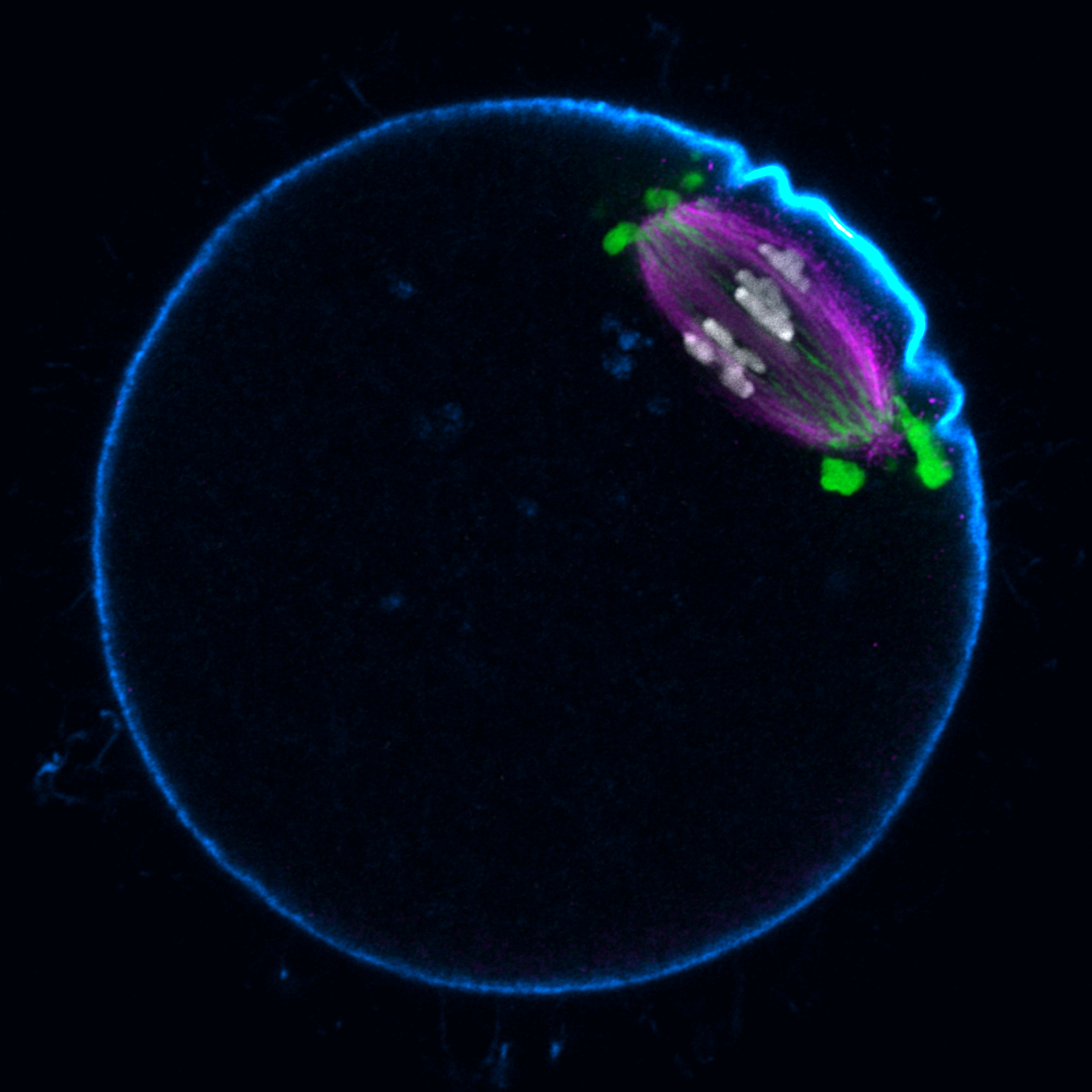 During meiosis, the egg (in cyan) halves its set of chromosomes (in grey) before fertilization. Since the first ultrastructural study dated back to the 50s, how the egg assembles the specialized spindle apparatus (in magenta) differently from normal body cells was poorly understood. In a recent study, we discovered the liquid-like spindle domain (in green), a membraneless compartment of microtubule regualtory factors, which is essential for spindle assembly and faithful chromosome segregation in mammalian eggs.